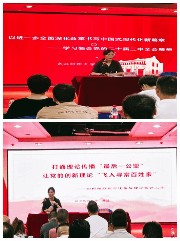 常沛教授在汉正街党群服务中心开展《以进一步全面深化改革书写中国式现代化新篇章——学习领会党的二十届三中全会精神》的宣讲。她从进一步全面深化改革的重大意义和总体要求、聚焦重点在更高水平上进一步全面深化改革、提高党对进一步全面深化改革的领导水平三个部分进行解读。在宣讲报告会结束后,常沛以《打通理论传播“最后一公里” 让党的创新理论“飞入寻常百姓家”》为题进行了基层宣讲员培训。在培训中,她指出:“新形势下,理论宣讲工作要聚焦‘为何讲’‘讲什么’‘为谁讲’‘如何讲’的根本性问题,既保持宣讲‘有高度’,又确保宣讲‘接地气’,推动党的创新理论真正‘飞入寻常百姓家’。”