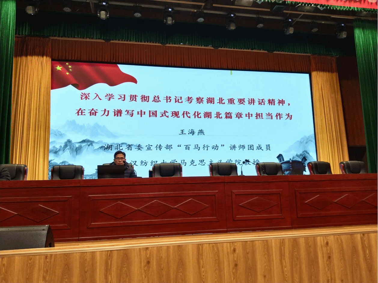 本次活动以“学习贯彻习近平总书记考察湖北重要讲话精神,谱写中国式现代化湖北篇章”为主题,围绕“深刻领会习近平总书记重要讲话精神”和“感恩奋进,共促发展”两大板块展开。王海燕作为湖北省委讲师团“百马行动”成员,结合习近平总书记考察湖北的生动细节,从科技创新、城乡融合、文化发展等多个维度剖析了讲话内涵。宣讲内容紧密贴合工作实际,兼具理论高度和通俗表达,为基层干部群众解读了如何在各自岗位上贯彻落实党的二十届三中全会精神。