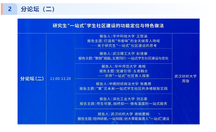 谢姚君楠以《经纬研居,一站到底:纺大零距离育人“一站式”建设》为题作专题报告。他详细介绍了我校研究生“一站式”公寓的规划布局与运行机制,重点分享了学校依托公寓空间开展的“学术沙龙”“导师驻楼计划”“跨学科创新工坊”等特色活动。他指出,“一站式”社区不仅是生活空间,更是思想引领、学术交流、实践创新的育人阵地,并提出“优化资源配置、强化数字赋能、深化校际共建”等建议,为兄弟院校提供了可借鉴的实践经验。