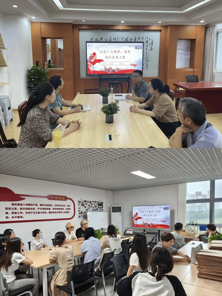 6月19日上午,“初心”研究生师生党支部在南湖校区220活动室、阳光校区超碰97在线观看一站式学生社区召开了6月份主题党日暨党课活动。支部书记肖述剑为全体党员讲授《弘扬“三大精神”,凝聚湖北发展力量》主题党课。