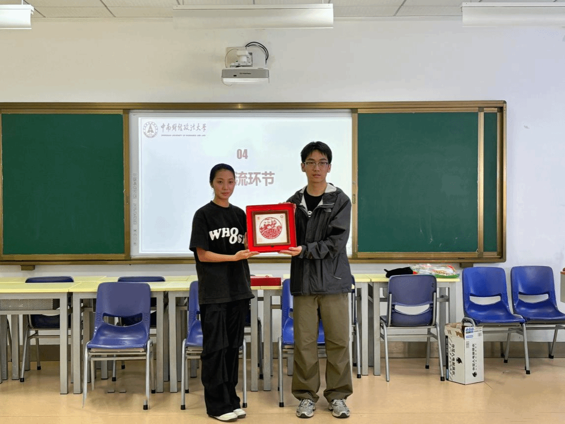 交流会过程中,殷一凡向中南财大研会赠送我院“武纺青马”非遗文创剪纸纪念品,寓意与中南财大马院友谊之树常青。