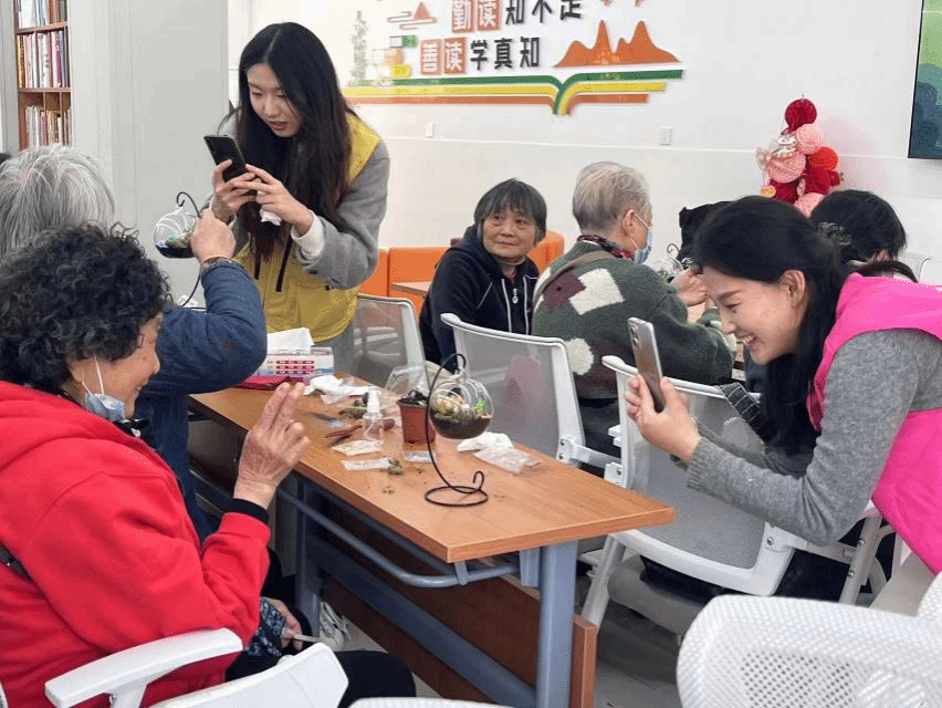 活动当天,天空湛蓝,阳光明媚,学院的同学们带着满心的期待和敬意来到了教职工社区。在这里,他们见到了那些曾经为学院付出辛勤努力的老教师们。活动一开始,学生们就向老教师们展示了如何制作绿植手工艺品。老教师们听着津津有味,不时发出赞叹的声音,他们对年轻人的创新思维和实践能力给予了高度评价。