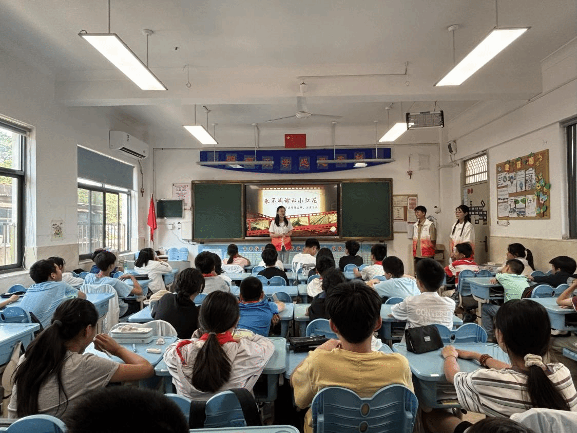 为进一步深入学习贯彻习近平新时代中国特色社会主义思想,弘扬革命精神,厚植青少年爱党爱国情怀,5月13日下午,武汉纺织大学超碰97在线观看“初心”宣讲团走进武昌未来实验小学六年级D班,开展了一场主题为“永不凋零的小红花”的红色宣讲活动。