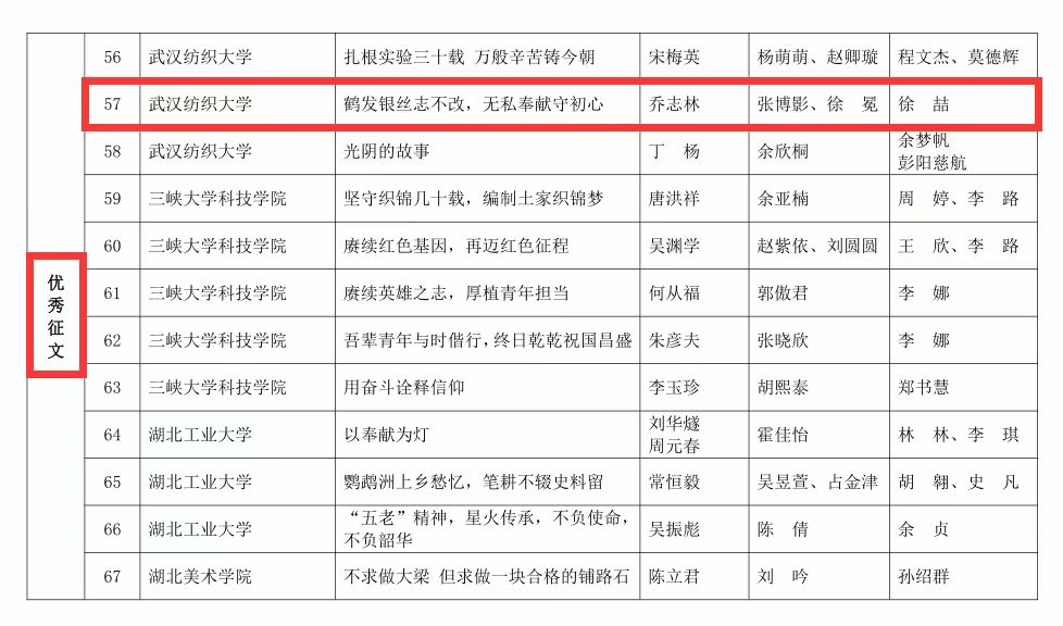 2023年12月20日,由湖北省教育厅关心下一代工作委员会主办的2023年全省“读懂中国-老少共话二十大,踔厉奋发新征程”活动评审结果揭晓,马院学子在活动中喜获佳绩。由学院2022级硕士研究生殷一凡、朱晓薇撰写的《在这个选择上,我从未犹豫!》获湖北省最佳征文奖,由2022级硕士研究生张博影、徐冕撰写的《鹤发银丝志不改,无私奉献守初心》获湖北省优秀征文奖。